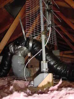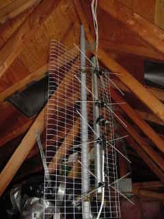 In July 2001 we moved into our new house and bought a Mitsubishi WS-65907 65" Diamond HDTV and a Mitsubishi SR-HD5 DirecTV/HD receiver. Nearly all of the San Diego stations broadcast a digital signal, so naturally I was eager to receive digital signals OTA (over-the-air). Because of the terrain in San Diego county, reception can be problematic. The signal reflecting from the multitude of hills can cause multipath problems. Being in a valley virtually assures poor or no reception. In addition, two stations, KFMB (CBS) and KGTV (ABC), broadcast from Mt. Soledad in La Jolla, three stations, KNSD (NBC), KSWB (WB) and KPBS (PBS), broadcast from Mt. San Miguel near Spring Valley, and one station, XETV (Fox), has their broadcast tower in Mexico on Mt. San Antonio. Fortunately we are on a ridge with line-of-sight to Mt. Soledad, 10 miles away at 224 degrees. Mt. San Miguel is 20 miles away at 147 degrees and Mt. San Antonio is 31 miles away at 171 degrees. Mt. Wilson, where all of the LA stations broadcast from, is 103 miles away at 330 degrees. This map shows the location of the San Diego area antenna locations as well as a line to Mt. Wilson: Initially I used the relatively inexpensive Radio Shack Double Bowtie Antenna (unfortunately, they no longer carry this antenna) on top of my TV and got good reception of KFMB and KGTV but this was only 10 miles away and line-of-sight to Mt. Soledad. I was also able to get KSWB from Mt. San Miguel, but not KNSD. KPBS was not yet online. XETV, the farthest station, did not come in consistently. I was also able to get some stations from LA, which all broadcast from Mt. Wilson, 103 miles away (!) at 329 degrees, but this was inconsistent and only at night. I then tried the Silver Sensor, an antenna from England. This is a highly directional antenna and required precise aiming for each direction that I wanted to receive. I was able to get better reception from XETV and also from the LA stations, but the LA stations still weren't consistent. I was still unable to get KNSD. In August 2001 I decided to install a Channel Master 3021 UHF antenna in my attic. I chose the CM-3021 antenna because it was small enough to be shippable, narrow enough to be able to be mounted between the rafters in my attic, and I had read a post on the HDTV Hardware Forum on AVS Forum from someone in Scripps Ranch that said that they could get all of the LA stations with this antenna. A Channel Master 9521 Antenna Rotator was necessary because of the four different directions of the broadcast towers. The CM-9521 Rotator is designed to mount on an antenna mast. It has four long permanent bolts protruding from the motor housing that are designed to be used with a couple of supplied brackets to clamp it onto the mast. There are no other mounting holes in the housing, so I decided to use those bolts to mount the rotator to a piece of wood which I could then screw to the joists in the attic. I used a scrap piece of 2x10 27" long as the mounting platform. I then drilled another scrap piece of wood so that the four bolts from the housing would protrude through the wood. I screwed that piece of wood to the platform at a 90 degree angle and then added a couple of side braces so everything was nice and sturdy. The housing was bolted to the platform and the platform was screwed into the joists in the attic. The antenna was then mounted onto a 5' Radio Shack antenna mast and the mast was installed onto the rotator. RG-6 coaxial cable was connected to the antenna and the coax cable and the control wire for the rotator were run over to the eaves, out through a hole I drilled in the eaves, down the outside wall, and then through another hole in the wall into the family room. The rotator control wire was hooked to the rotator controller, which can be operated via an infrared remote control. Pictures of the installation are below. I still can't get KNSD, but that is primarily because they broadcast at only 18 kW ERP (Effective Radiated Power) and the other digital stations broadcast at 300 to 700 kW ERP. The San Diego stations that I get consistently are KGTV, KFMB, XETV, KSWB, and KPBS, which came online in September. I can now get all of the LA stations consistently, including KCET (PBS) and KNBC, which were my primary goals. The other LA stations that I get are KABC, KCBS, KTTV (Fox), KCOP (UPN), KTLA (WB). |