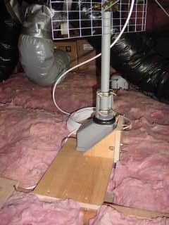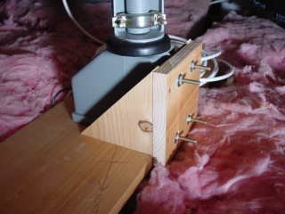 Rotator and mounting platform. The mounting platform for the rotator was made out of scrap wood. The bottom piece is a 1x10 27" long to fit across the joists. The coax cable from the antenna